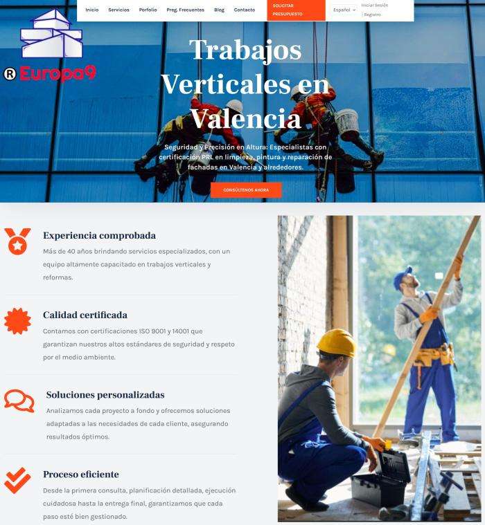 Europa 9 es una empresa líder en trabajos verticales y servicios de construcción y reformas en Valencia, así como en poblaciones cercanas y en proyectos de gran escala en toda España. Con más de 40 años en el sector, esta empresa ha logrado consolidarse como una de las referencias en trabajos en altura, reformas, impermeabilizaciones y diversas instalaciones gracias a su profesionalismo, experiencia y una amplia gama de certificaciones de calidad y seguridad. Europa 9 se compromete a brindar soluciones prácticas y personalizadas que garantizan tanto la seguridad como la durabilidad de cada proyecto, superando las expectativas de sus clientes, tanto particulares como profesionales.